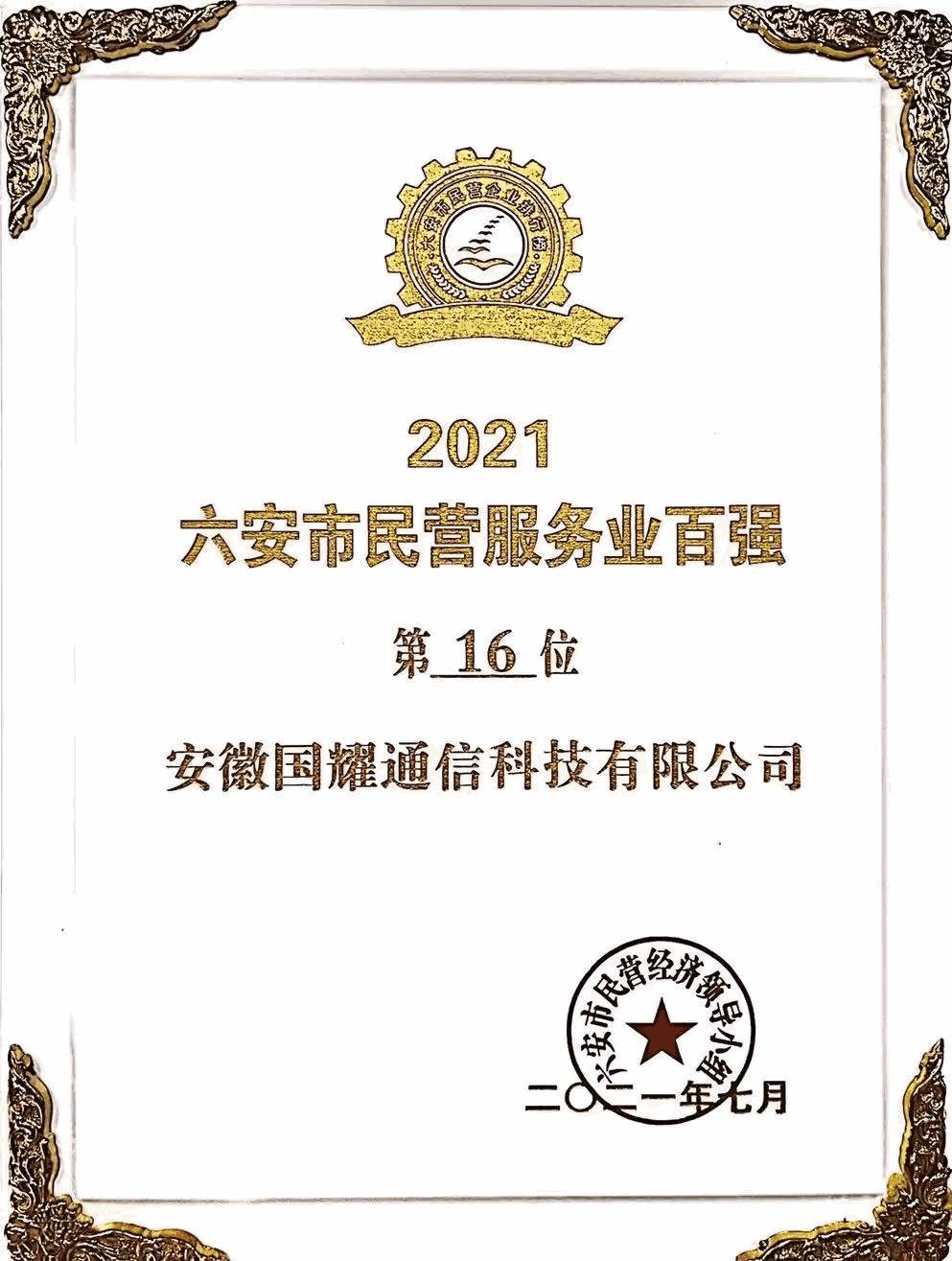熱烈祝賀安徽國耀通信科技有限公司榮獲“2021六安市民營服務業(yè)百強”光榮稱號